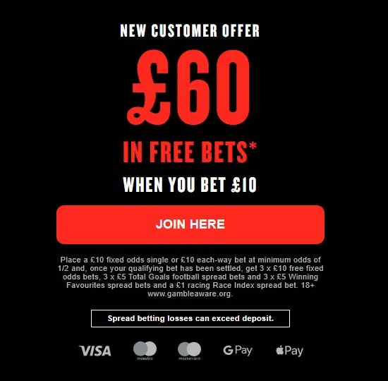 - Get 3 x £10 free fixed odds bets, 3 x £5 Total Goals football spread bets and 3 x £5 Winning Favourites spread bets and a £1 racing Race Index spread bet.